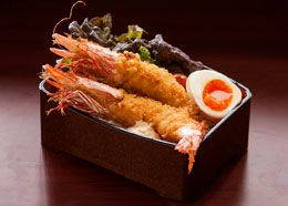 大きな足赤えびを丸ごとフライに。ご飯に乗せてお重にしました。特製ソースをかけて野菜とともにお召し上がりください。